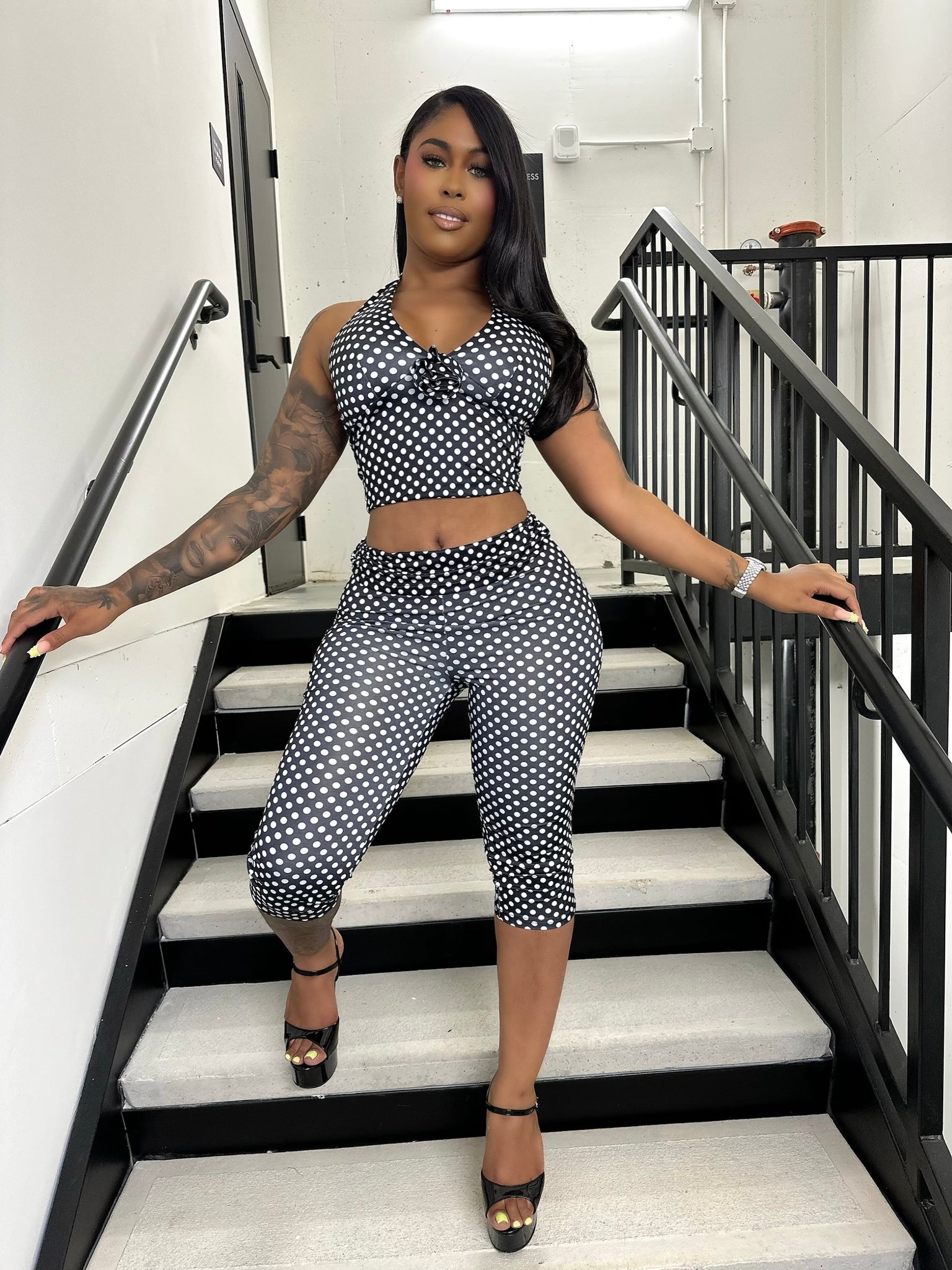 The black-and-white dotted print adds a fun, retro-baddie vibe — cute for daylight flexing, sexy enough for nighttime stepping. Whether you’re climbing stairs, taking pics, or running errands like that girl, this set hugs the body in all the right places and keeps you looking perfectly spotted from every angle.