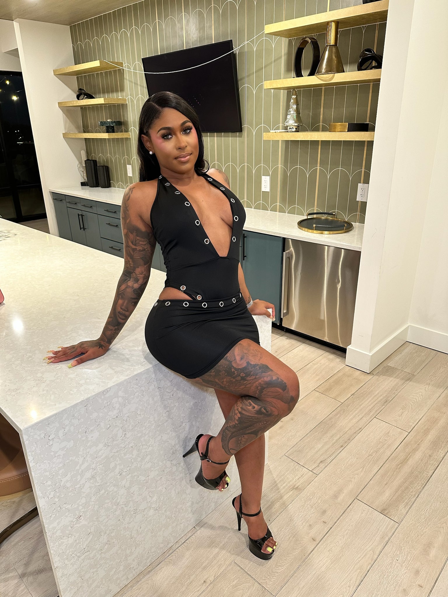 The Steel Temptation Cutout Set – Black is a body-snatching two-piece designed for nights you plan on stealing every stare in the room. Featuring a deep-V plunge bodysuit with silver grommet hardware and a matching high-rise mini skirt, this set shapes your waist, lifts your curves, and delivers full baddie impact from the front and the back.