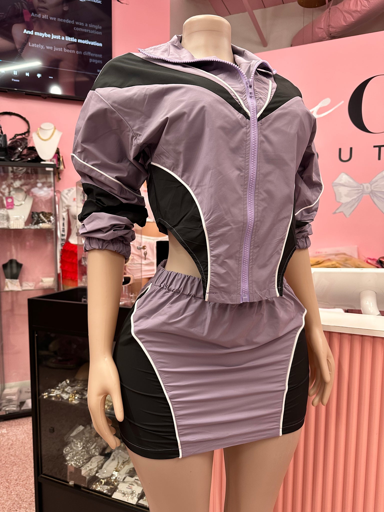 2 Tone Windbreaker Skirt Set- Purple/Blk
