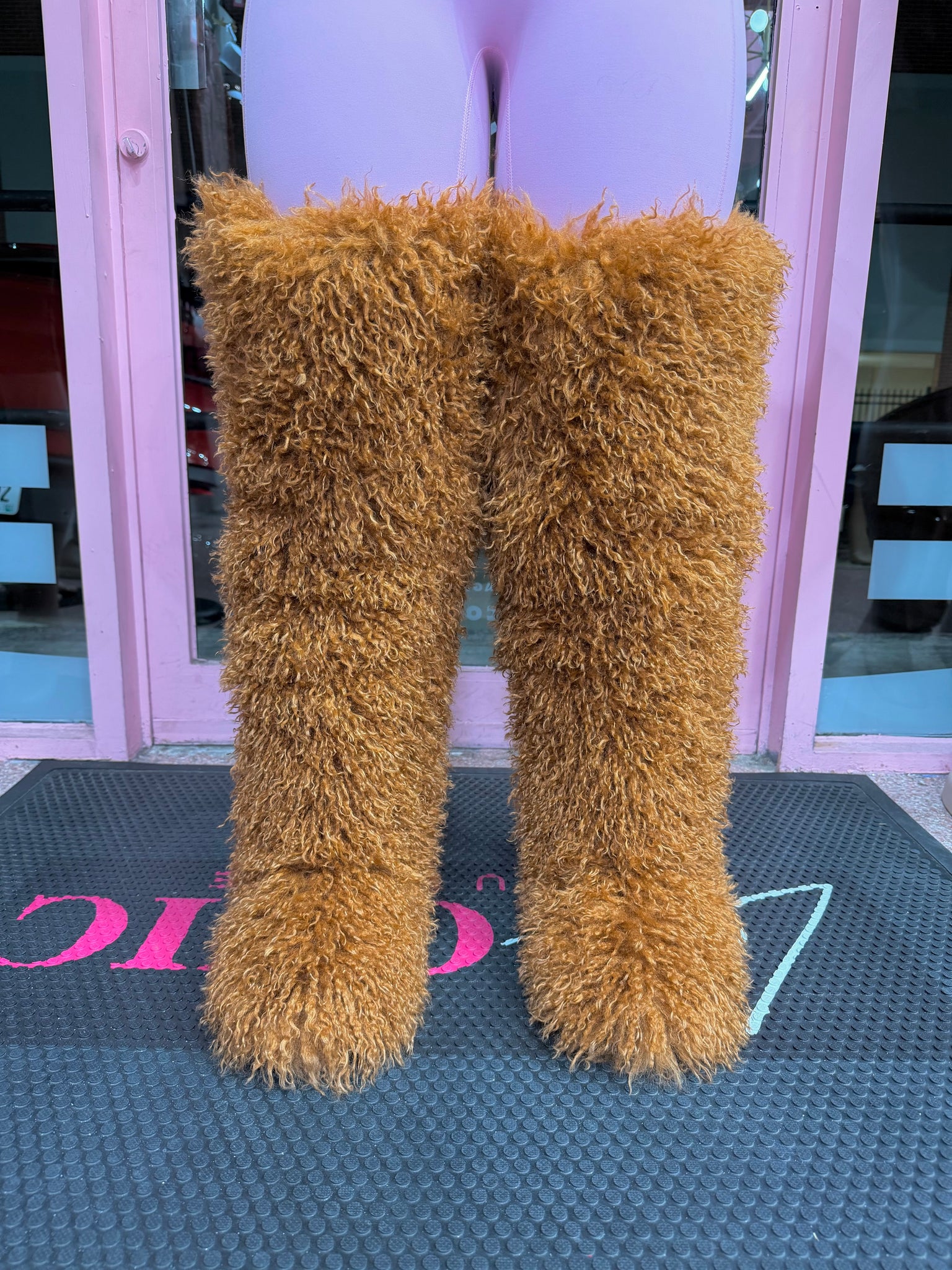 Mongolian Fur Thigh High Boots – Luxe Brown Faux Fur Fashion Statement