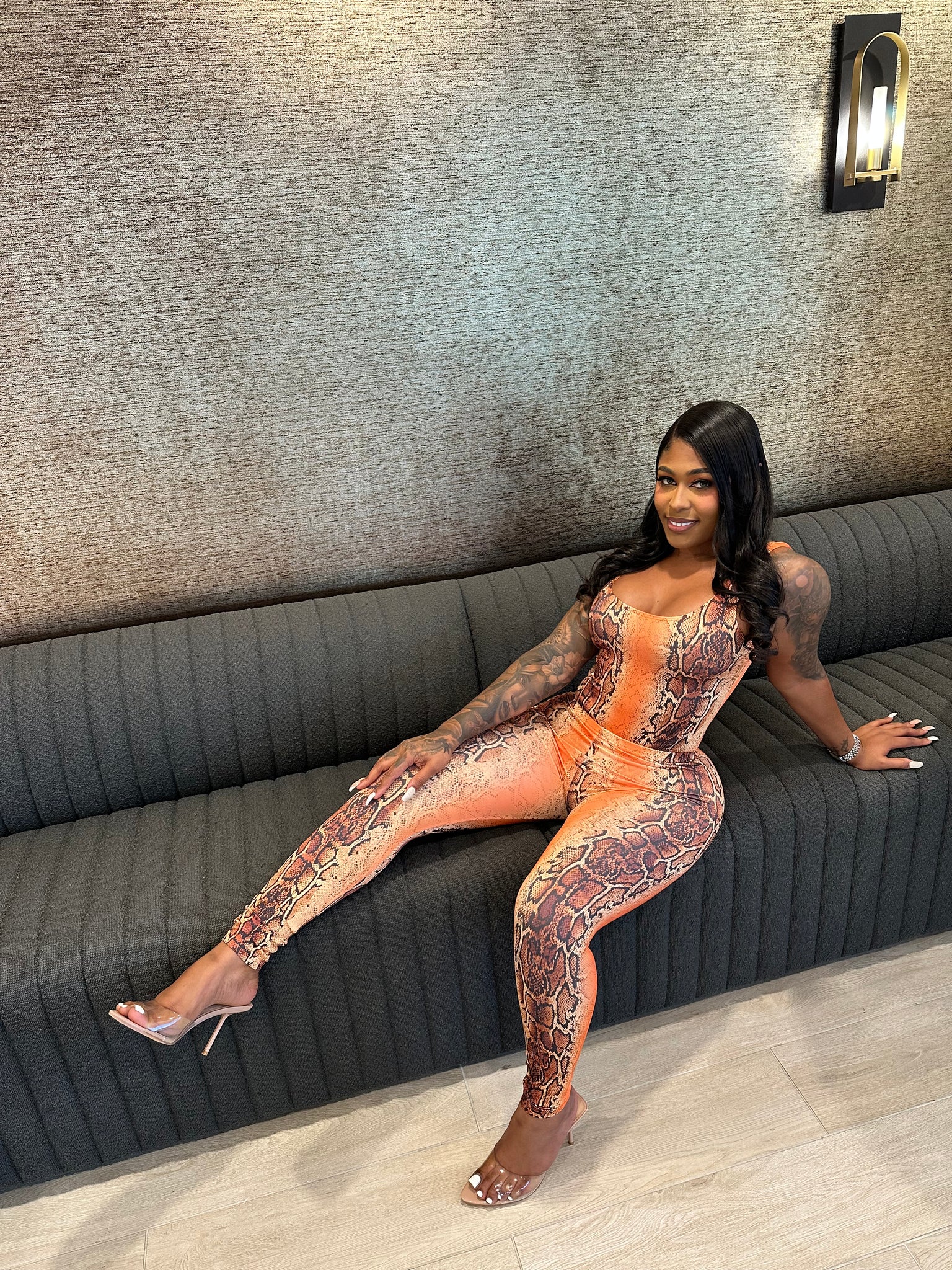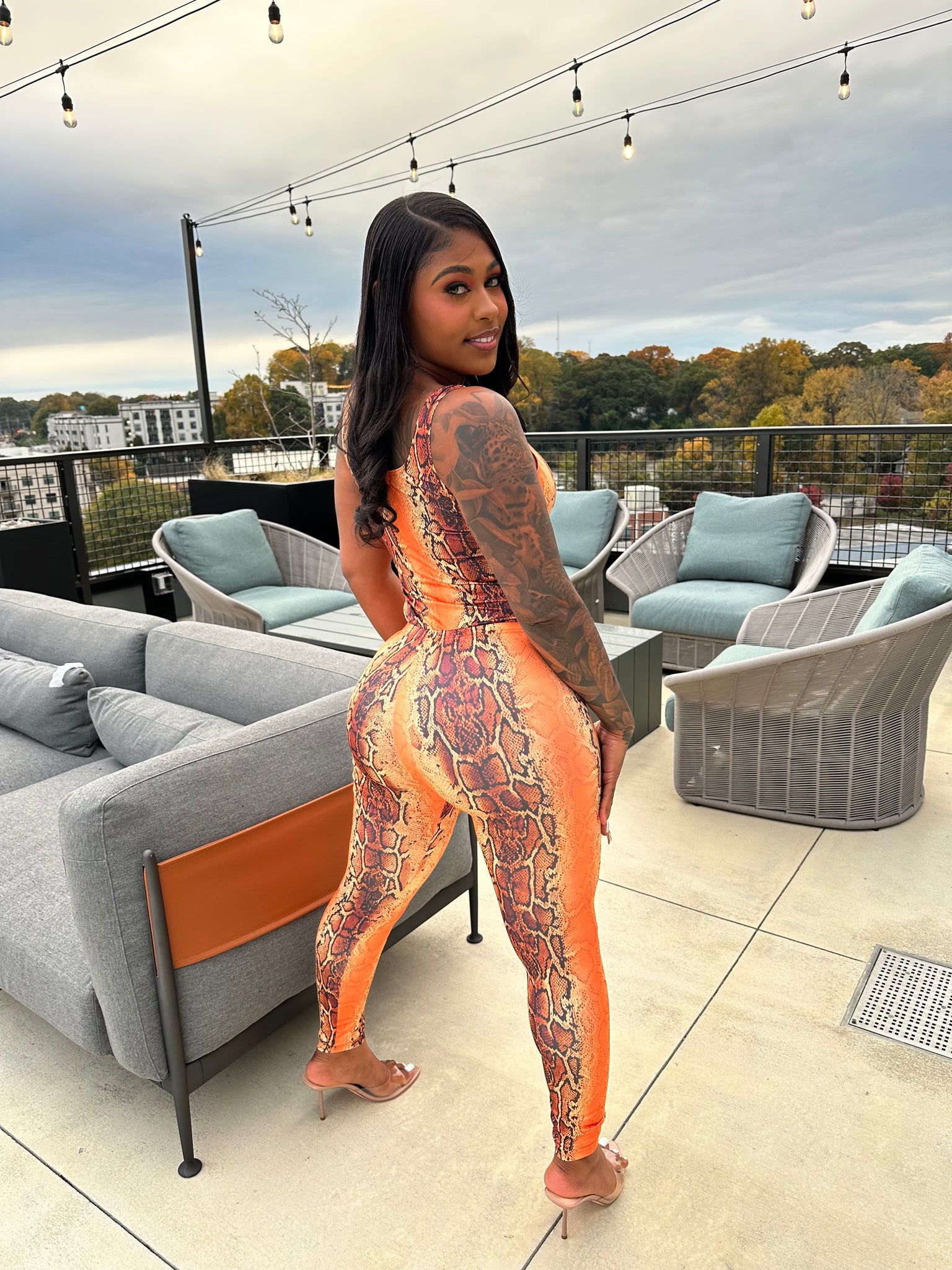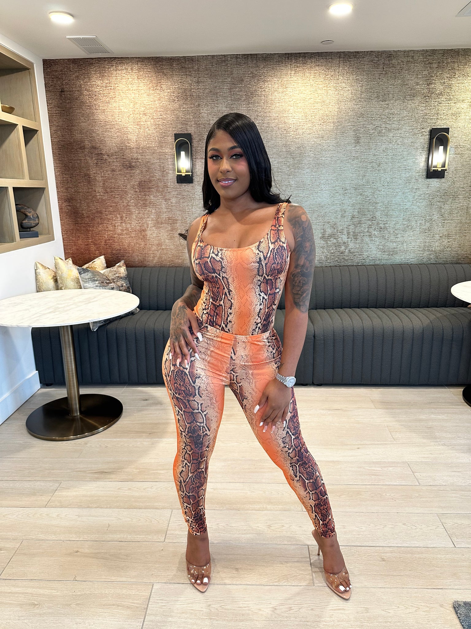 Strike with confidence in our Venom Bodysuit Legging Set – Orange, the ultimate head-turning look for the fearless femme. Designed with a sleek snakeskin print in fiery orange and bronze tones, this two-piece set hugs every curve and enhances your shape with a sculpted, ultra-snatched fit. The bodysuit features a flattering scoop neckline, body-contouring seams, and a secure snap-closure bottom for easy wear. The matching high-waist leggings are buttery soft, very stretchy, and designed to elongate your legs while lifting and shaping the hips for that signature Luxe silhouette.