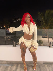 Chic Fringed Cream Knit Set with Cover-Up and Mini Skirt