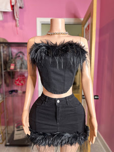 Too Cute Black Denim Crop Top & Mini Skirt Set with Feather Trim