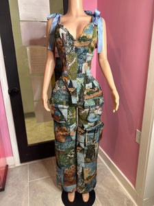 Artistic Patchwork Corset & Cargo Pant Set- Blue Multi