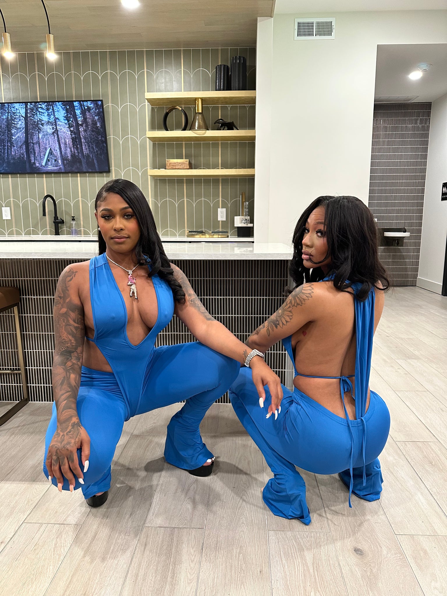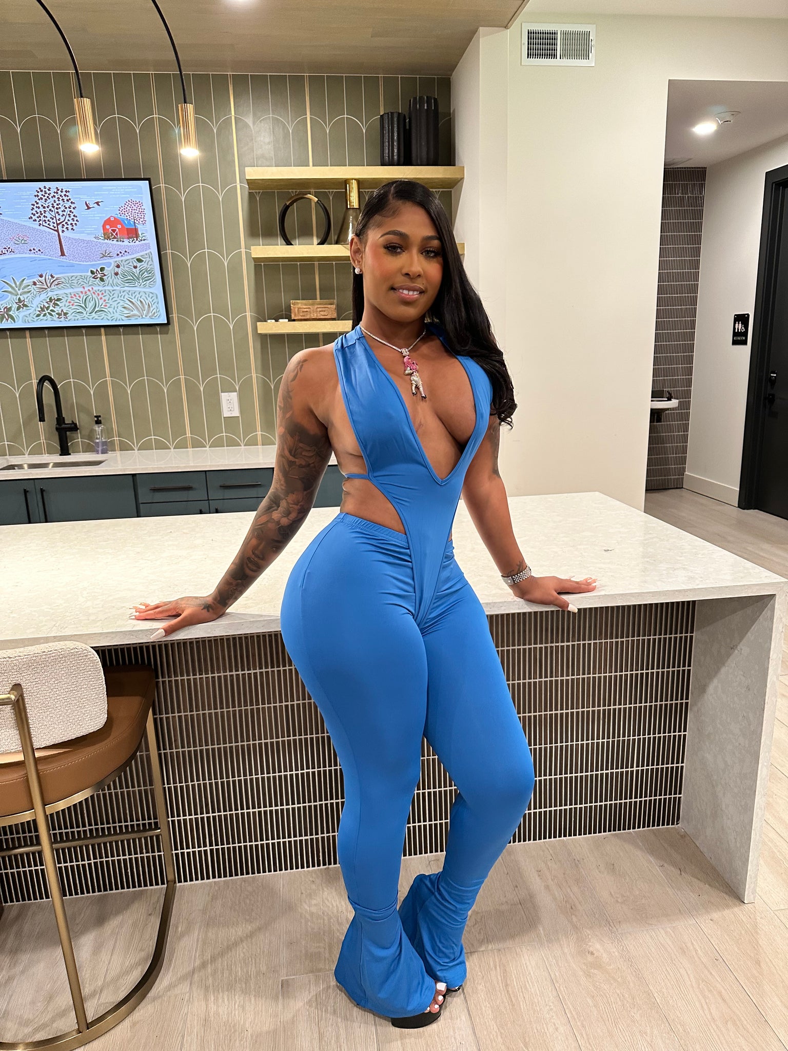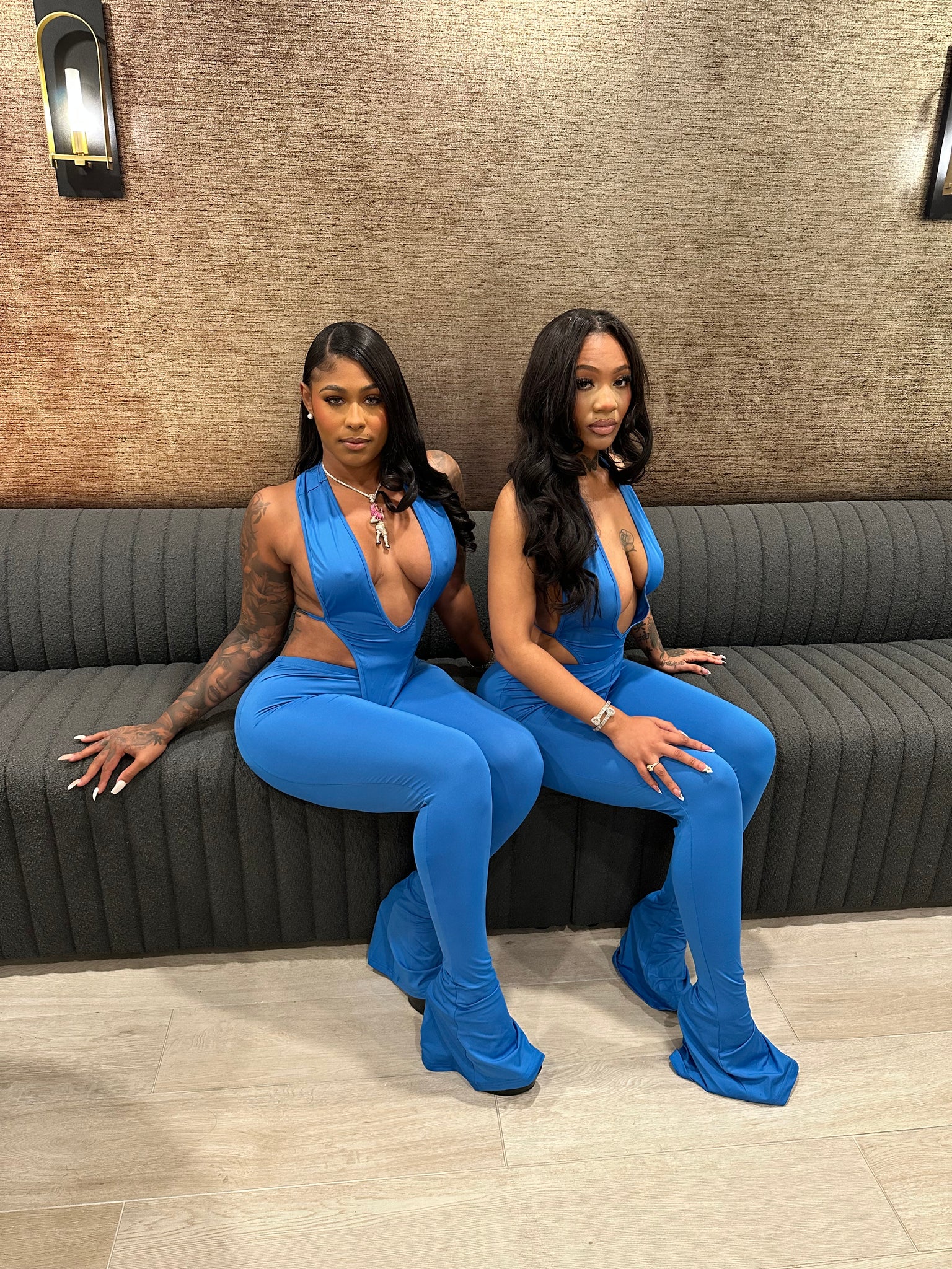 Turn heads from every angle in the After Hours Plunge Set, the ultimate curve-sculpting duo for nights you’ll never forget. This two-piece set features a deep-plunge halter bodysuit with a snap closure at the bottom, paired with matching ultra-stretch flare pants that contour your shape flawlessly.