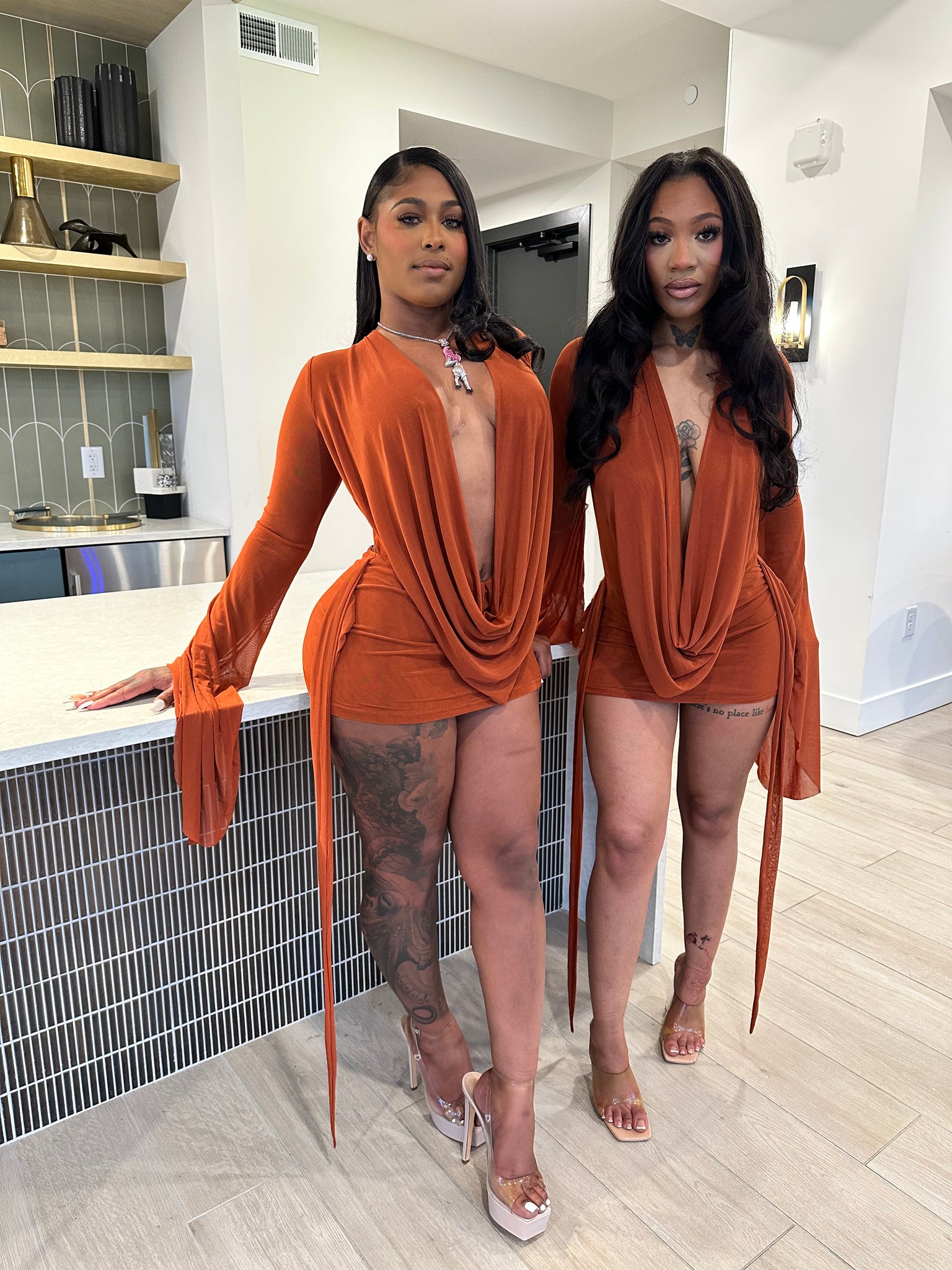 Step into effortless luxury with the Drip Effect Drape Mini Dress — the ultimate blend of sultry confidence and elevated style. This long-sleeve bodycon dress features a plunging draped neckline that perfectly frames your figure, while the ultra-soft stretch fabric molds to your curves for that snatched-but-comfortable fit. The back steals the spotlight with a sexy open cut-out tie design, creating a show-stopping 360° silhouette.
