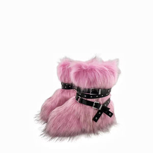 Faux Fur Trendy Ankle Boots with Buckle Straps- Pink
