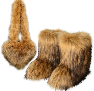 Wynter Fluffy Faux Fur Boots & Heart Shape Bag Set- Brown