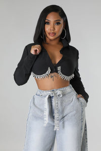 Stunning Rhinestone-Embellished Cropped Button-Up Top- Black