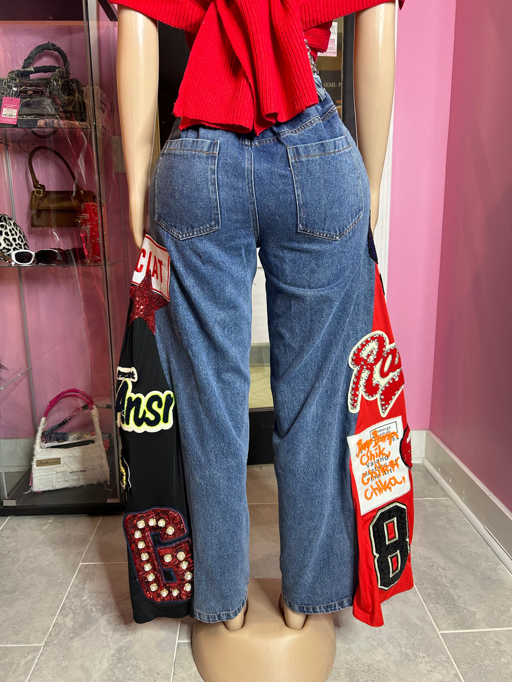 - Style: Wide leg with patchwork detailing