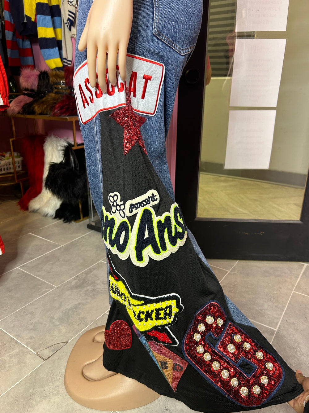 The standout feature of these pants is the vibrant and eclectic patchwork detailing, combining various textures and embellishments that add personality and flair. Perfect for dressing up or down, they can be paired effortlessly with a cropped top or a casual tee, making them a versatile addition to your wardrobe.