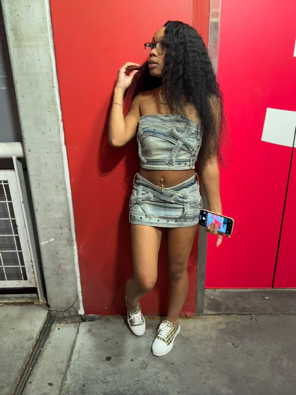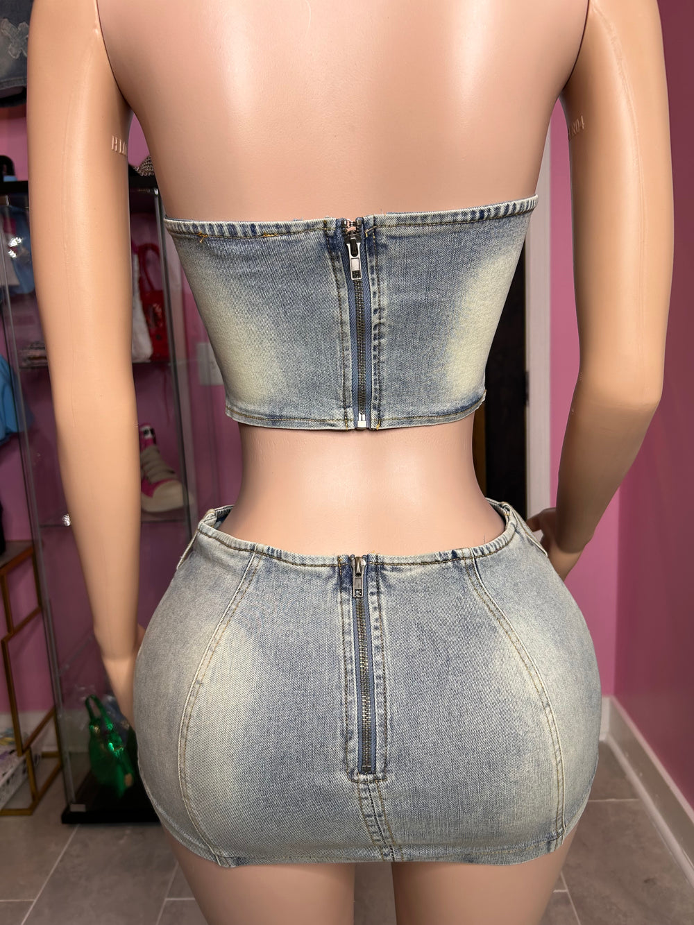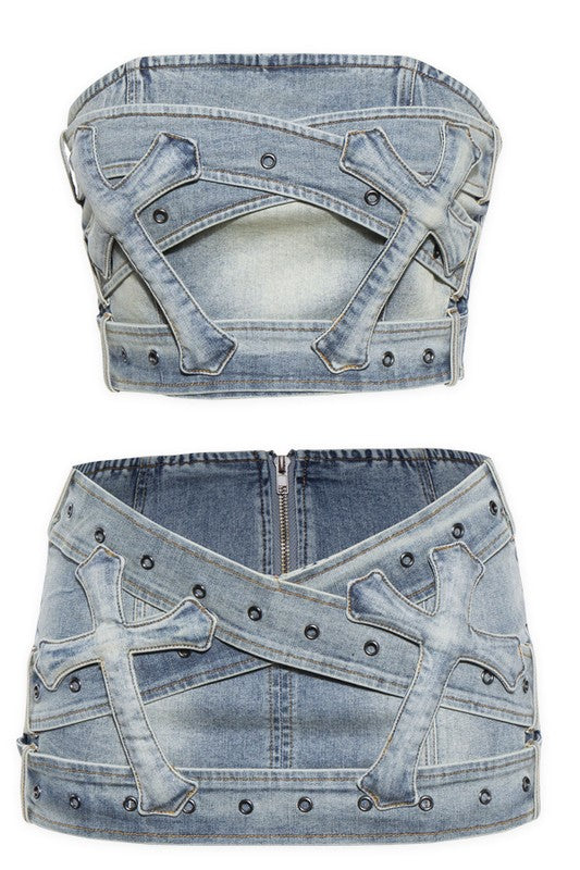 Make a statement with this trendy Tube Top & Mini Skirt Denim Crosses Graphic Set! Get ready to turn heads in this trendy denim 3D Cross Patch Tube Top and Mini Skirt set! Made from high-quality denim fabric, this set features a unique 3D cross patch design that adds a touch of edgy style to your look. The tube top is form-fitting and flattering, while the mini skirt is perfect for showing off your legs. Whether you're heading to a music festival, a night out with friends, or just want to make a fashion statement, this set is sure to impress. Pair it with your favorite heels or sneakers for a versatile and stylish outfit that will have you feeling confident and chic.
