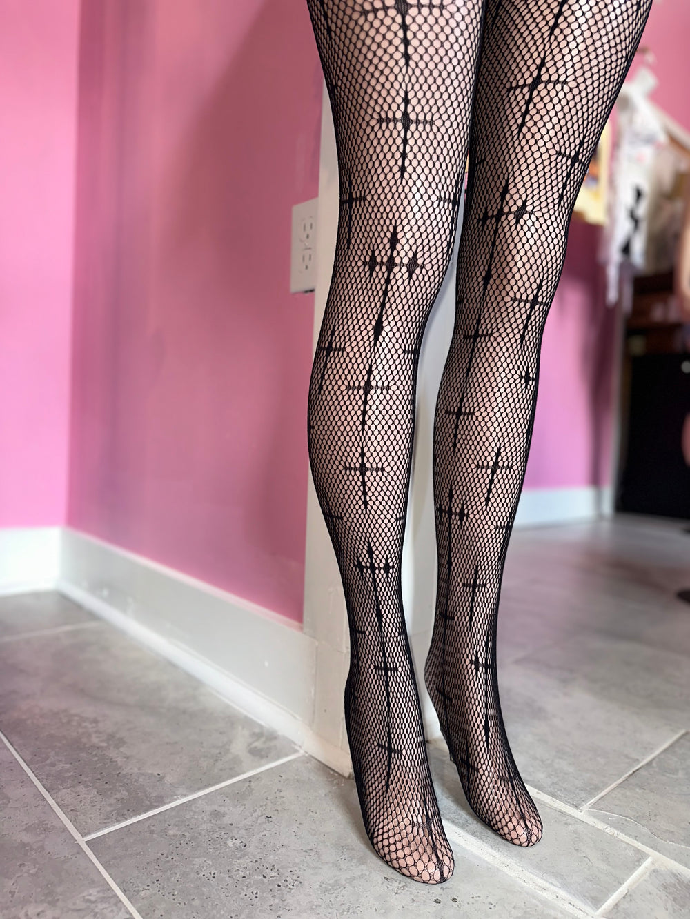Make a bold and daring statement with these black fishnet tights featuring crosses. These edgy and unique tights are designed to add a touch of attitude to your outfit while still providing comfort and style. The fishnet texture adds a sexy and provocative element, while the crosses add a cool and rebellious vibe. Perfect for adding an unexpected twist to any outfit, these tights are sure to turn heads and make a statement. Pair them with a mini skirt, dress, or shorts for a trendy and fashion-forward look. Stand out from the crowd with these black fishnet tights with crosses and showcase your individuality and confidence.