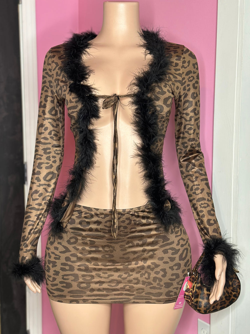 Unleash your wild side with our Fur-tastic Leopard Skirt Set featuring exquisite details that make a statement. This stylish ensemble includes a form-fitting mini skirt and a matching long-sleeve top adorned with glamorous faux fur trim. The top showcases a sultry tie closure at the front, allowing you to adjust the fit to your preference, while the mini skirt complements your silhouette beautifully. Crafted from a soft and stretchy fabric, this set offers both comfort and allure, making it perfect for a night out or a daring day look. Elevate your wardrobe with this chic leopard print set that pairs perfectly with your favorite accessories for an unforgettable style.