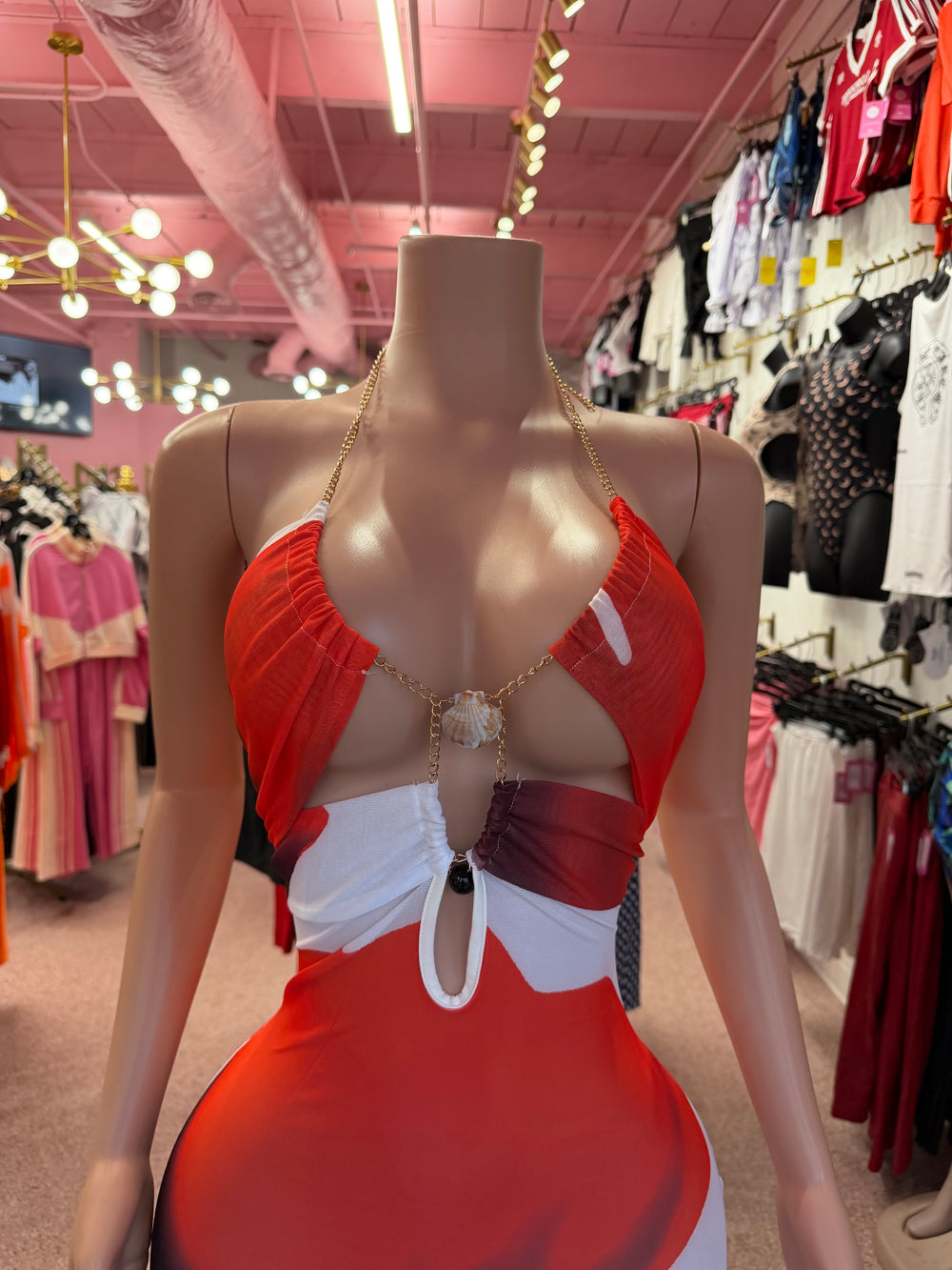 Turn up the temperature ❤️🔥 The Heatwave Muse Maxi Dress is that show-stopping piece you wear when being seen is the goal. Featuring a sultry halter neckline with luxe chain detail and a bold red multi abstract print, this dress hugs every curve while serving effortless vacation energy.
