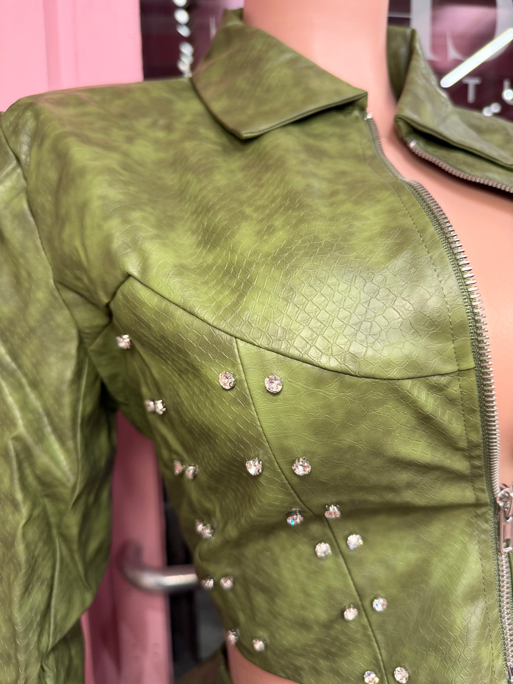 The luxe faux leather finish paired with metallic stud accents creates a standout look perfect for fashion girls who love elevated street glam. Designed with a true-to-size fit and tailored silhouette, this set is made for stepping out and being seen.