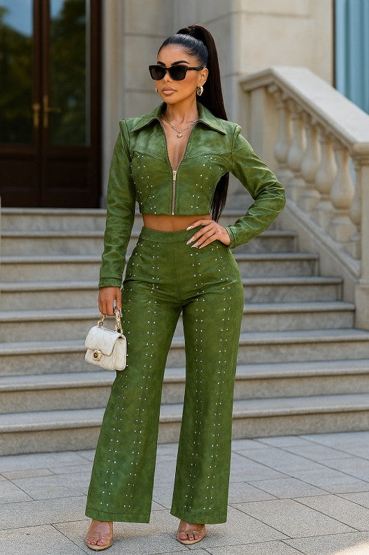 Step into statement energy with the Studded Status Faux Leather Set — the ultimate bold baddie two-piece designed to command attention. Featuring a structured cropped zip jacket with stud detailing and matching high-waist flare pants, this set delivers sleek confidence with a modern edge.
