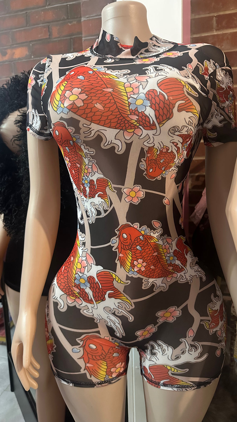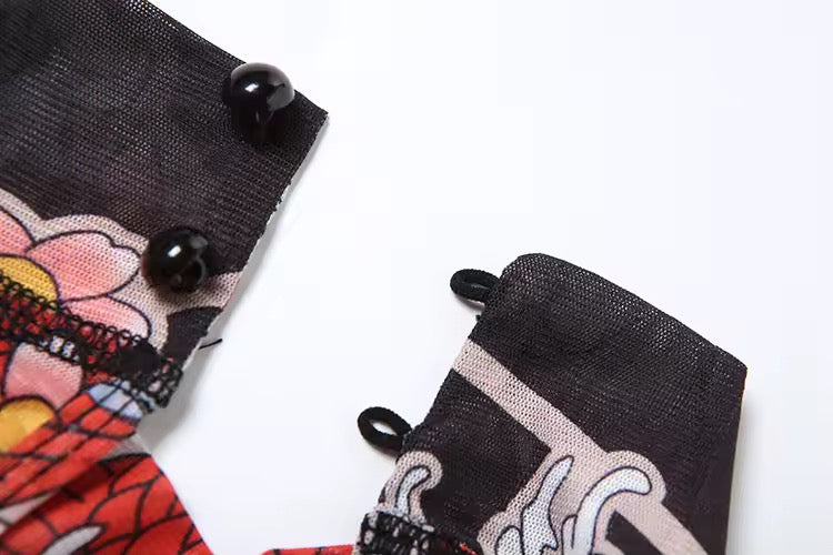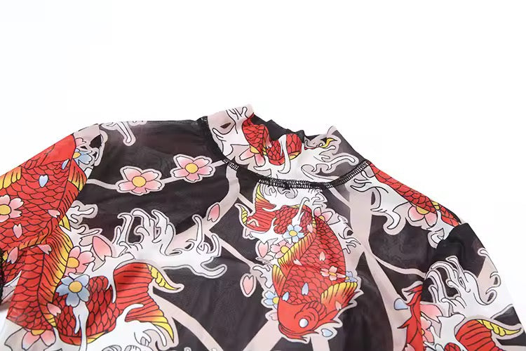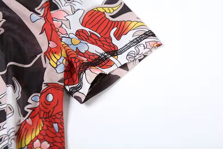 Elevate your style with our Tattoo Mesh Romper, an eye-catching piece that seamlessly fuses bold artistry with contemporary fashion. Crafted from a soft, breathable mesh fabric, this romper features a stunning koi fish and cherry blossom print that embodies beauty and tranquility. The high neck design and short sleeves add a touch of elegance, while the backless cut provides an avant-garde twist to your outfit.