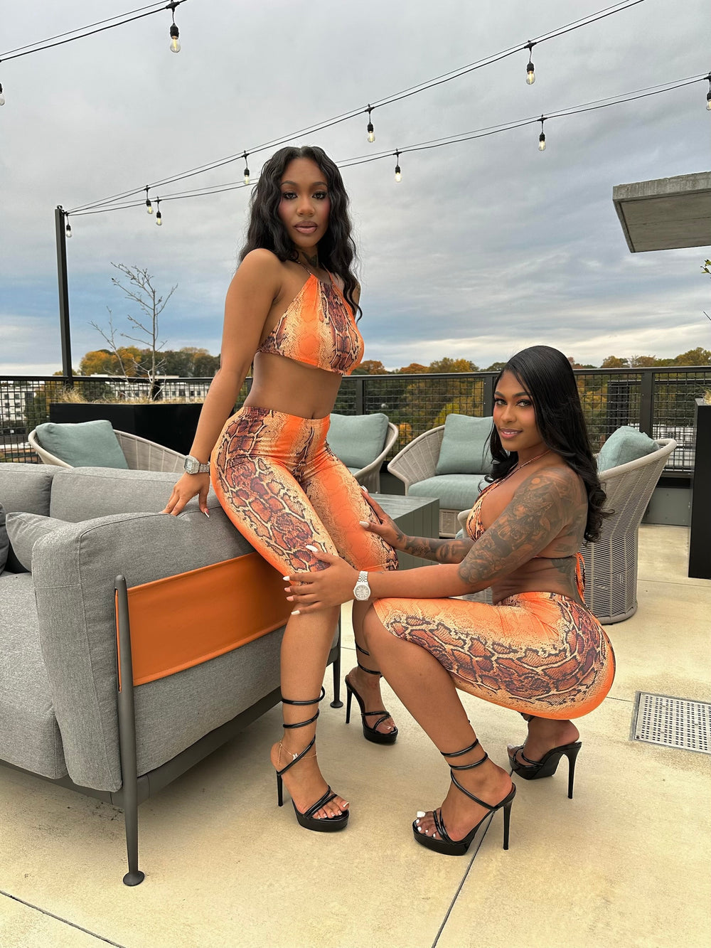 Crafted from a premium stretch python-print fabric in a vibrant blend of orange, tan, and deep brown tones, this set moves with your body—perfect for day parties, rooftop vibes, or nightlife takeovers. The breathable, second-skin material ensures comfort while delivering a luxurious, body-contouring fit.