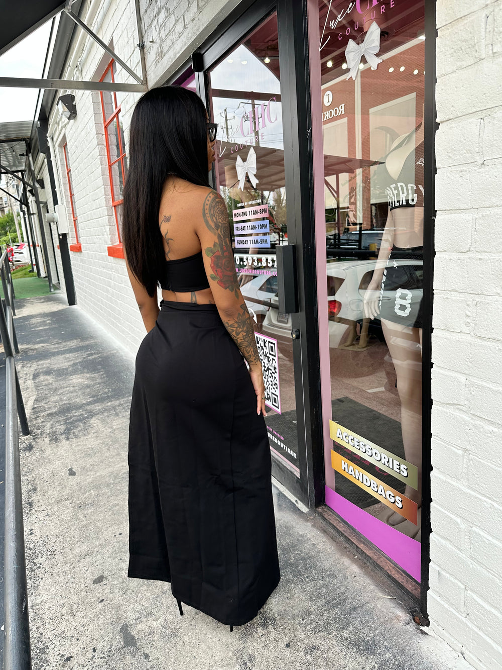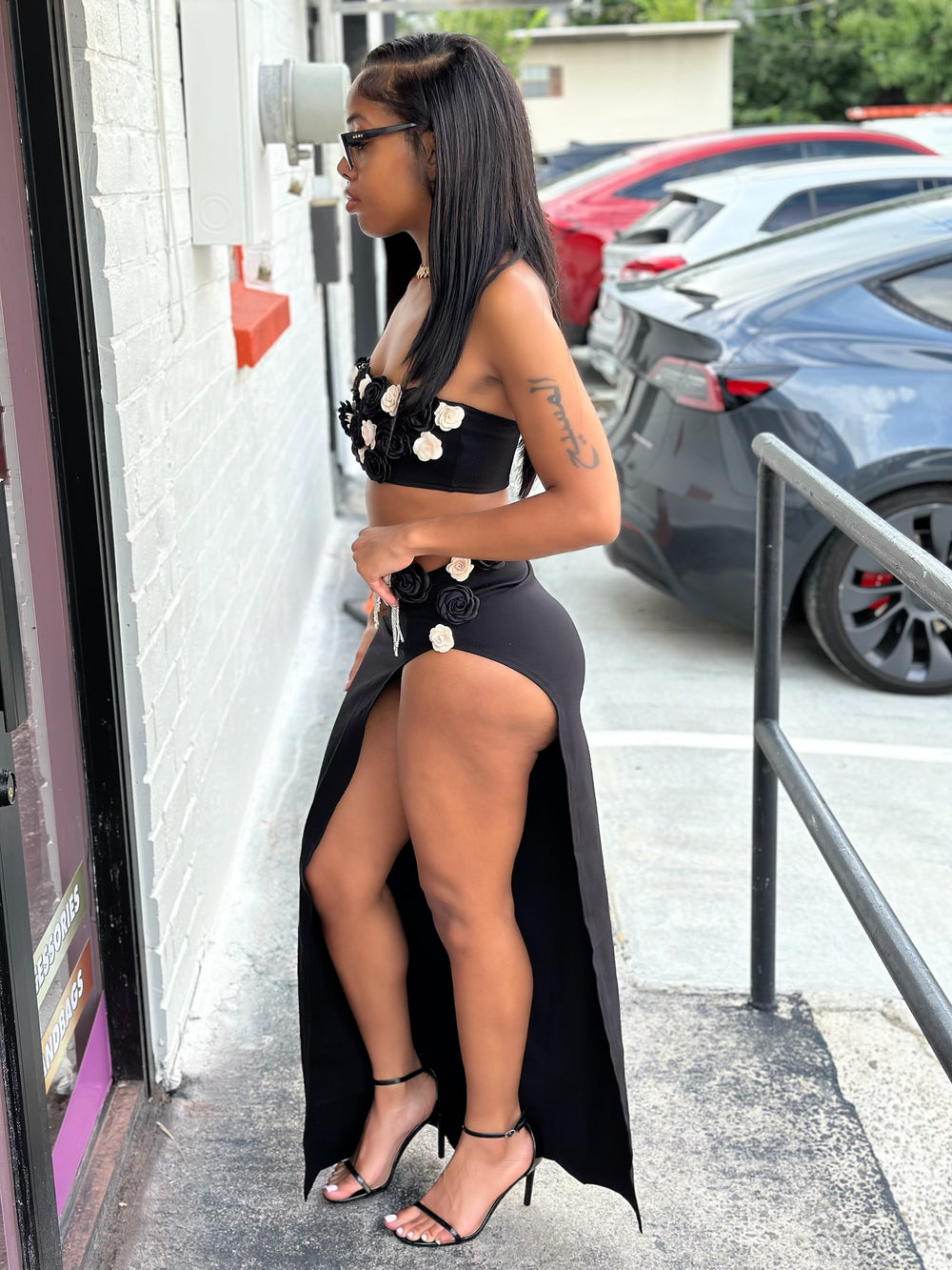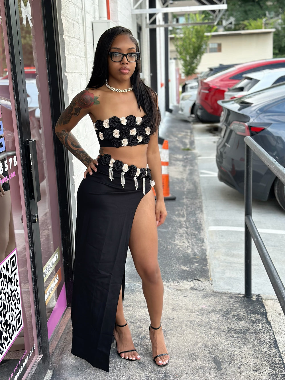 Elevate your style with the Amelia 3D Floral Embellished Crop Top and High-Waisted Maxi Skirt Set, a striking two-piece ensemble designed to captivate and flatter. The crop top is adorned with exquisite 3D floral appliqués that create a textured, dimensional look, blending elegant black and soft cream roses for a unique contrast. The high-waisted maxi skirt features a daring side slit that elongates the legs, paired with matching floral details on the waistband, accentuated by subtle cliff-hanger chains for an extra touch of glamour. The fitted silhouette perfectly complements the feminine floral accents, making this set an ideal choice for making a bold, fashionable statement.