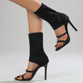 Elevate your style with the Eyes On Me Open Toe Heel Boot in classic black. These chic ankle boots feature a sophisticated stiletto heel that adds both height and elegance, while the open toe and strappy design offer a bold, modern edge. The sleek black fabric hugs the ankle snugly, creating a seamless elongation of the leg. Perfect for making a statement, these boots blend the allure of open-toe sandals with the sophistication of high-heel boots, making them an essential addition to any fashion-forward wardrobe.