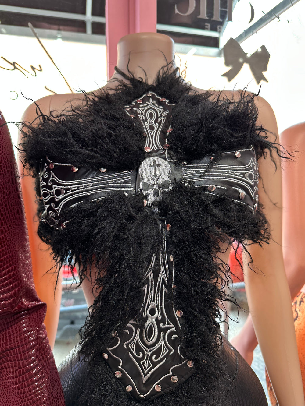 Step into your dark-glam era with the Gothic Cross Fury Halter Top – Black, a dramatic, eye-catching statement piece designed for the boldest baddies. Featuring a large embroidered gothic cross centerpiece surrounded by metal stud accents and wild luxe faux-fur trimming, this top brings pure rock-star fantasy to any look.