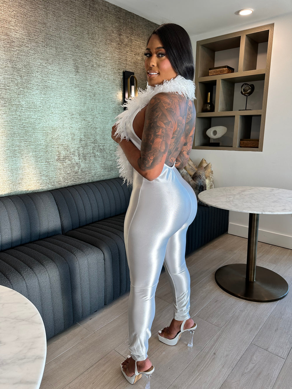 Step into the spotlight with our Make An Appearance Halter Neck Mongolian Fur Jumpsuit. This luxurious piece, available in stunning black and white options, features a plush, fluffy texture crafted from high-quality Mongolian fur, ensuring both style and comfort. The stretchy fabric allows for a flattering fit that hugs your curves beautifully.
