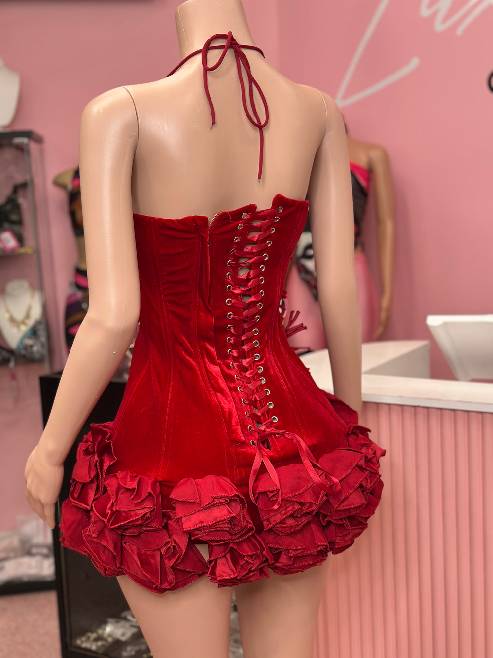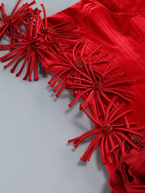 Step into the spotlight with our "Meet Me At The Party" Floral Effect Mini Dress, a striking piece designed to turn heads and elevate your evening look. Crafted from rich velvet, this form-fitting mini dress features a halter neckline with delicate ties, a structured bustier, and a corset-style lace-up back for adjustable fit and enhanced silhouette. The dress is further adorned with exquisite floral-inspired embellishments cascading down one shoulder and a dramatic ruffled hem, adding texture, volume, and an artistic flair. Available in deep crimson red and classic black, this dress is the quintessential combination of elegance and bold style for your special occasions.