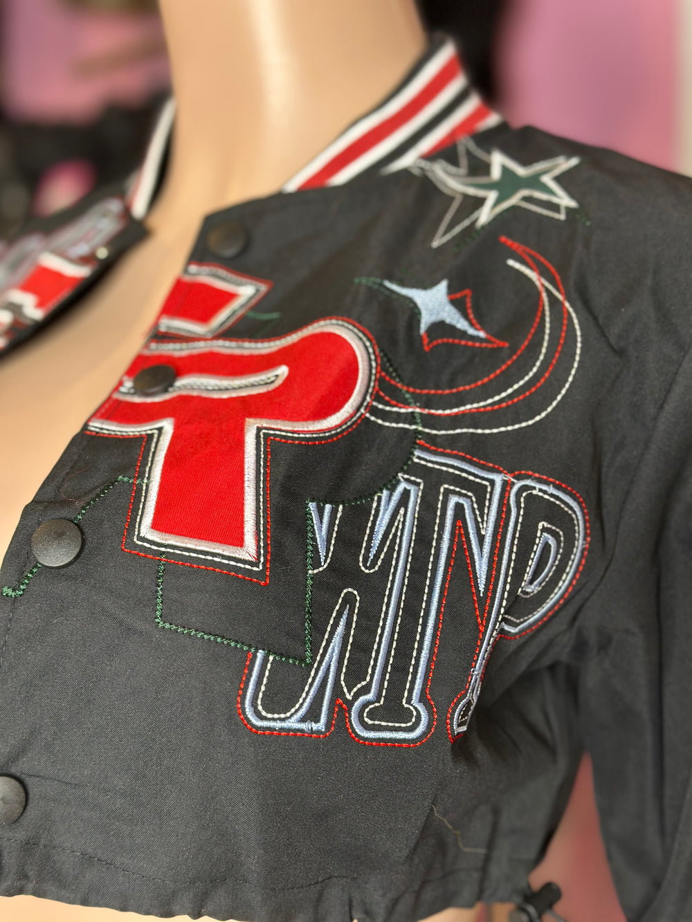 Unleash your inner rebel with our Motor Girl Cropped Biker Jacket, designed for those who crave style and adventure. This eye-catching jacket showcases a striking black fabric adorned with bold, embroidered graphics, including stars and racing motifs that celebrate the thrill of the open road. Featuring a relaxed fit and a cropped silhouette, it perfectly complements high-waisted bottoms, making it a versatile addition to any wardrobe.
