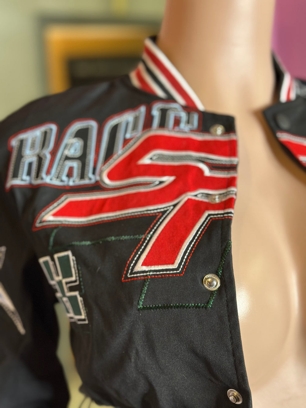 The jacket is designed with a classic striped ribbed collar and cuffs, offering a trendy yet sporty appearance, while snap buttons provide easy closure. Crafted for comfort, this piece is perfect for layering with your favorite tees or wearing over a daring outfit for a night out. Whether you're hitting the streets or attending a motorsport event, this jacket ensures you stand out in style.