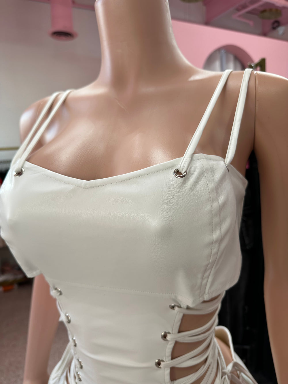 - Side cutout paneling with metal eyelet detailing for edgy definition