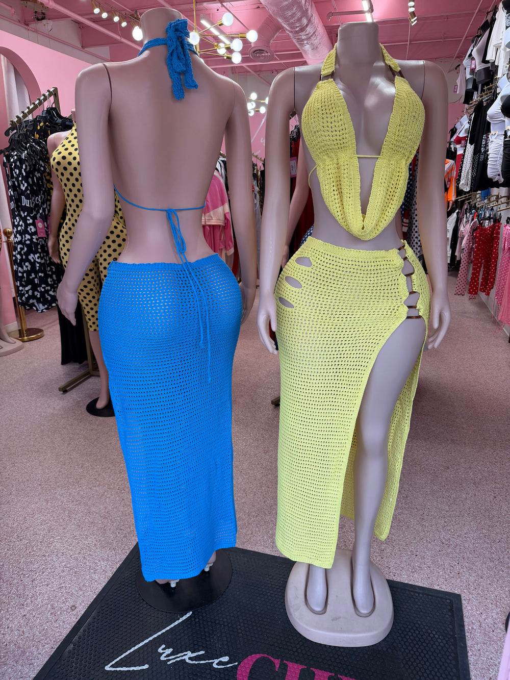 Turn the heat ALL the way up in our Tropic Pressure Crochet Set 🌴🔥 This bold, head-turning two-piece features a plunging halter top with an open-back tie design and a curve-hugging crochet maxi skirt with a daring thigh-high slit and side cutout details. Whether you’re stepping out on vacation, poolside, or outside at night—this set is guaranteed to have all eyes on YOU.